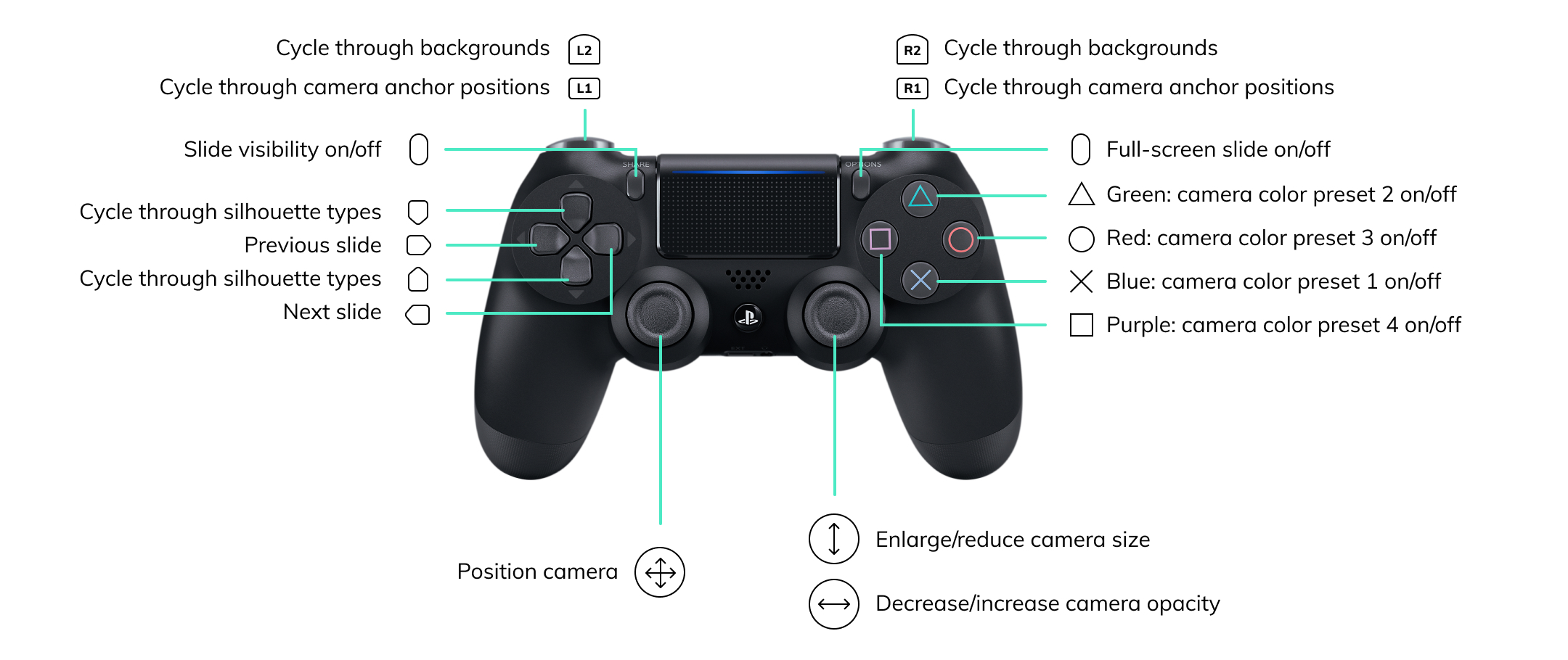 La aplicación debería estar lista para funcionar desde el primer momento. La siguiente tabla muestra la asignación de botones del control del PS4 para Studio.